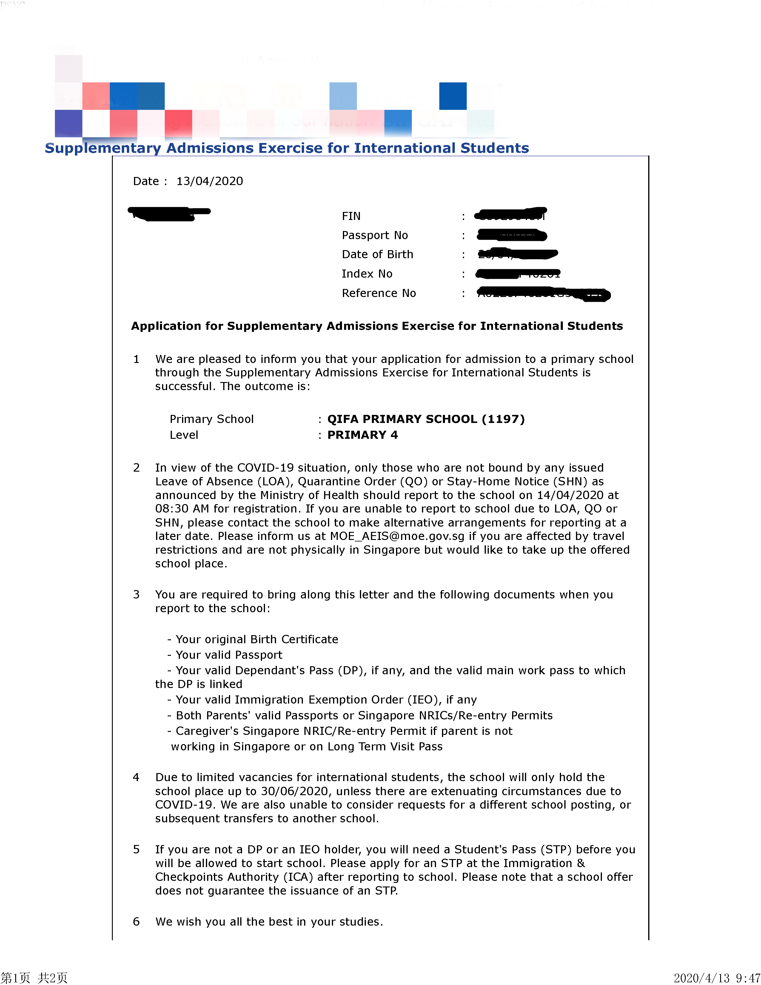 王同学在2020年的S-AEIS考试中顺利通过,并成功地被启发小学录取。